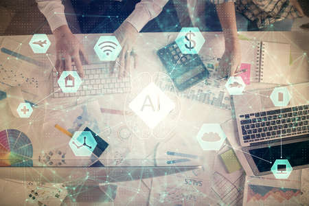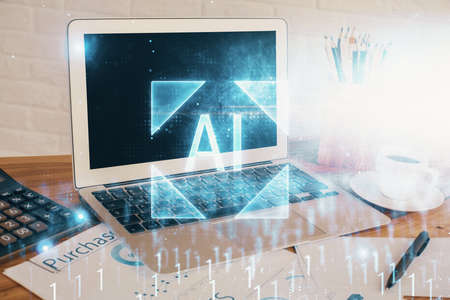 Double exposure of creative artificial Intelligence abbreviation hologram on Chicago office buildings background. Future technology and AI concept