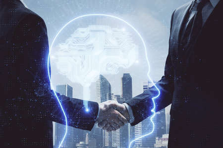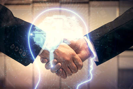 Double exposure of brain hologram and handshake of two men. Partnership in IT industry concept.