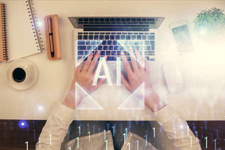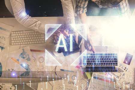 Creative artificial Intelligence symbol concept and modern digital tablet on background, top view. Multiexposure