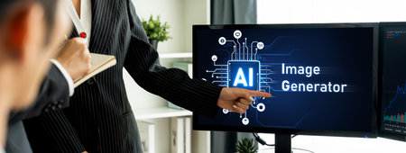 Engaging visual representation of AI assistants in a business setting, showcasing professionals utilizing digital devices for communication and innovative collaboration. Amity