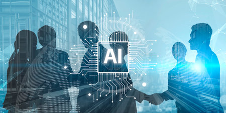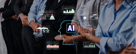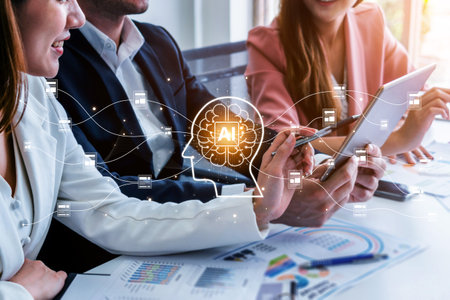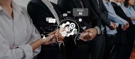 Image showcases business professionals working together, integrating artificial intelligence concepts into their strategy, emphasizing modern teamwork and innovation in the workplace.