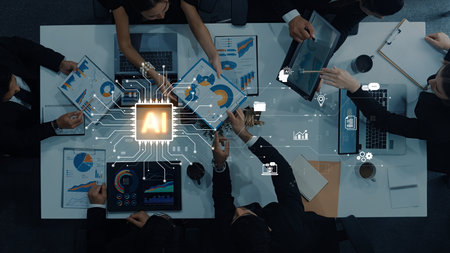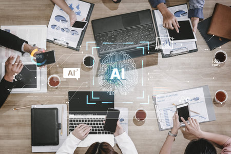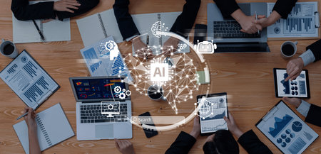 Aerial view of business professionals collaborating in a meeting, using laptops and tablets to analyze data, emphasizing AI technology integration and strategic planning.
