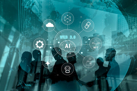 The Web 3.0 technology ecosystem, the next generation of the internet. A concept of a decentralized web with AI, blockchain, NFT, and cryptocurrency. Motif