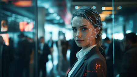 Business professionals engage with technology and artificial intelligence concepts in a modern workspace, emphasizing interaction and innovation through digital elements.