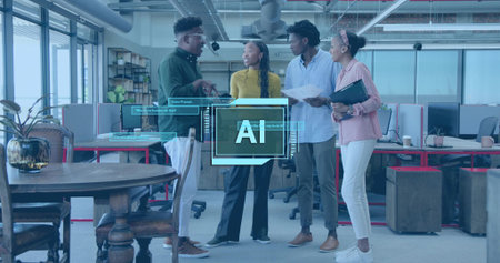 Discussing group of professionals wearing business-casual, talking in open office with AI overlay. Teamwork, collaboration, brainstorm, ideation, startup, coworking, modern