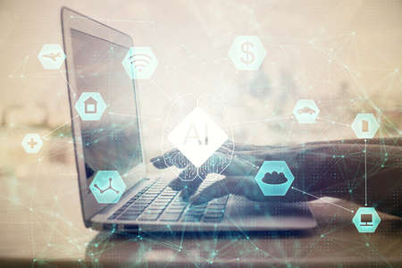 Creative artificial Intelligence symbol concept with modern laptop on background. Multiexposure