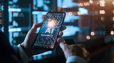 A smartphone screen is displayed with an AI interface, emanating data streams with a dark background. The scene emphasizes digital communication and the flow of information, composed with selective focus. This image is suitable for various commercial purposes, including technology articles and marketing materials.