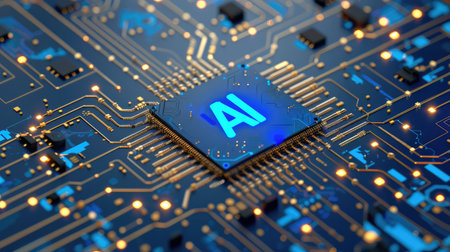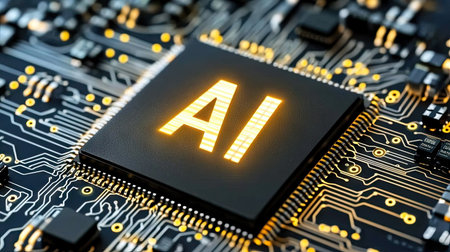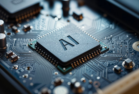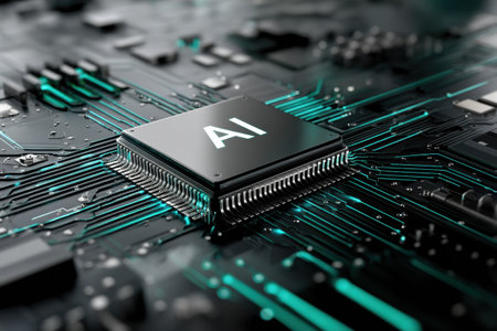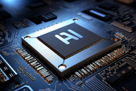 A detailed microchip marked ai amid intricate circuit paths, evoking advanced technology against a sleek, dark background.