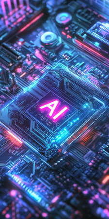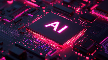 Detailed view of a central processor unit labeled AI, illuminated by neon pink and purple lights, set against a complex circuit board.