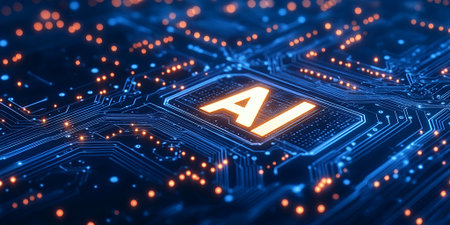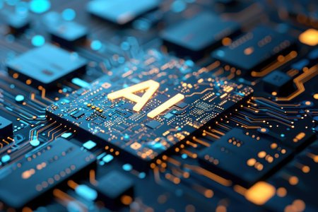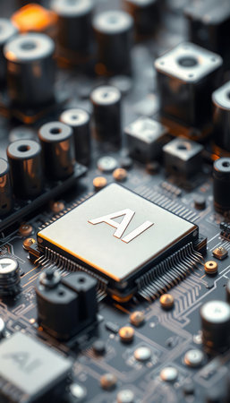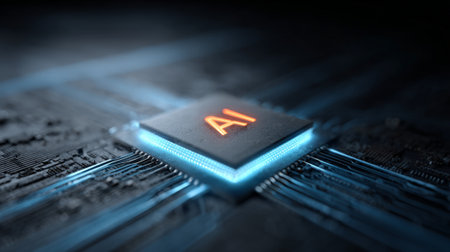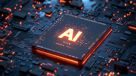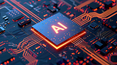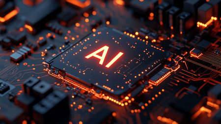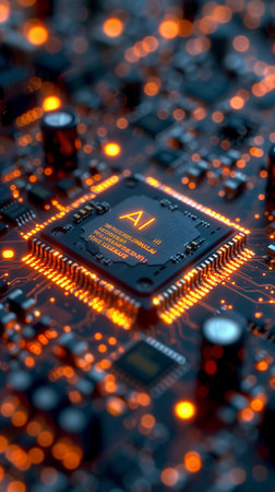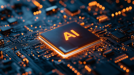 Detailed view of a futuristic AI processor on a circuit board, showcasing intricate glowing orange circuitry and the letters AI, symbolizing advanced technology.