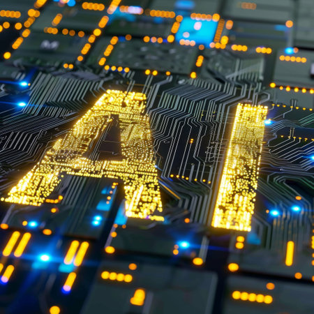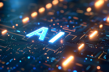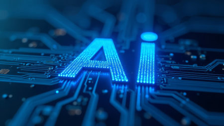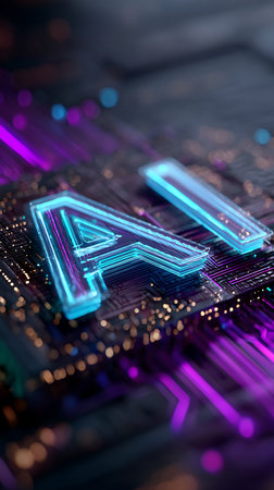 close-up of letters A and I are illuminated with a futuristic digital light, resembling tiny LED lights or microchips, Artificial Intelligence Concept on Circuit Board