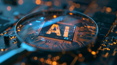 magnifying glass over dedicated AI microchip on electric circuit board, artificial intelligence and GPU cloud computing concept, technology and research. High quality photo