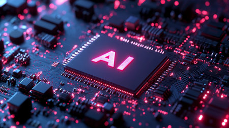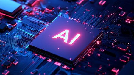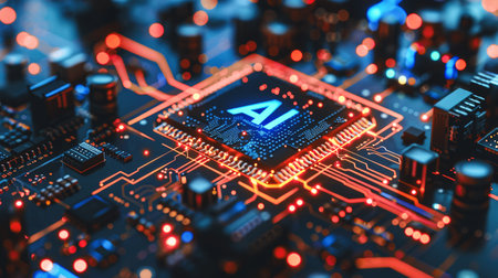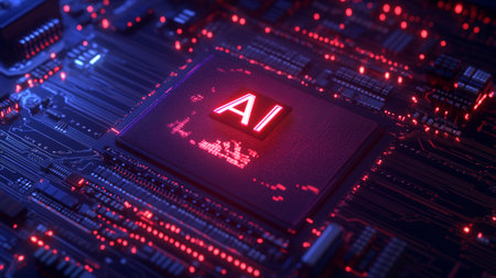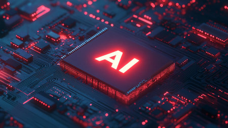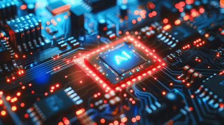 Macro view of a central processing unit (CPU) with 'AI' illuminated in neon red, set against a complex electronic circuit board with blue and red lights.