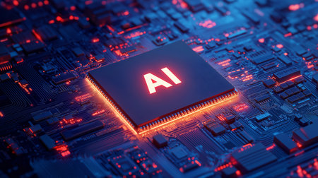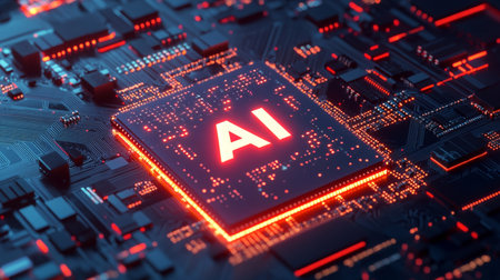 AI chip on illuminated circuit board, technology concept.