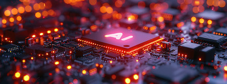 Detailed view of a circuit board featuring a central AI processor illuminated with bright red light, representing artificial intelligence and modern tech.