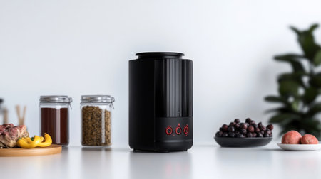 A black cylindrical device stands on a white surface, accompanied by jars and food items.