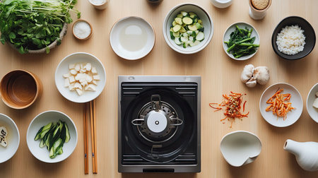 A beautifully arranged minimalist Shabu setup featuring fresh ingredients and a sleek cooking station, perfect for a stylish cooking experience.