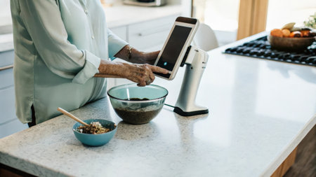 Senior woman using smart kitchen device and tablet for cooking