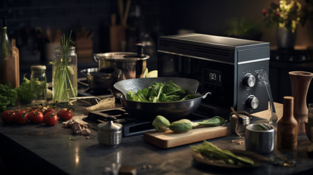 Modern table and electric stove with utensils and vegetables in the kitchen beside window : Generative AI