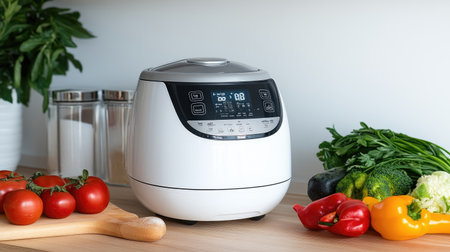 A stylish white rice cooker sits on a kitchen counter, surrounded by vibrant fresh vegetables. This multifunctional appliance enhances meal preparation while promoting healthy cooking habits.