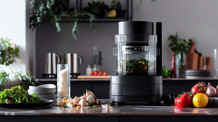 A beautifully stylish kitchen scene showcases a modern blender surrounded by vibrant fresh vegetables and eggs