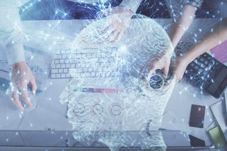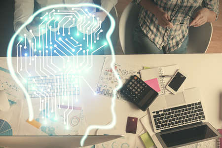 Double exposure of man and woman working together and human brain hologram drawing. Brainstorm concept. Computer background. Top View.