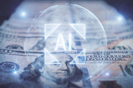 Double exposure of creative artificial Intelligence abbreviation hologram on Chicago office buildings background. Future technology and AI concept