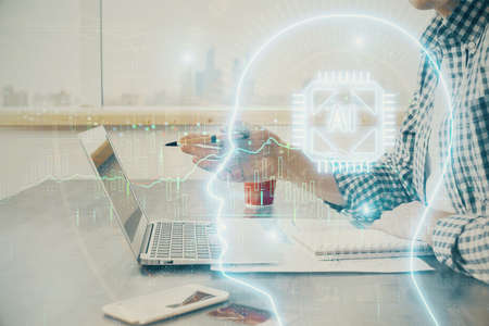 Double exposure of creative artificial Intelligence symbol with modern laptop on background. Neural networks and machine learning concept