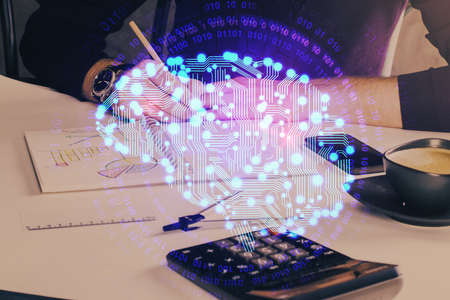 Multi exposure of writing hand on background with brain hologram. Concept of self learning.