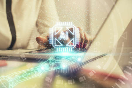 Double exposure of creative artificial Intelligence abbreviation and hand working with a digital tablet on background. Future technology and AI concept
