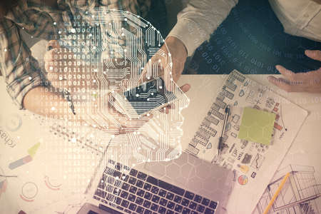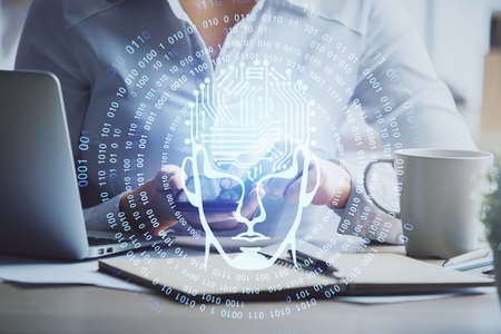 Creative artificial Intelligence symbol concept with modern computer on background. Double exposure