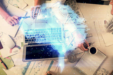Double exposure of man's hands typing over computer keyboard and brain hologram drawing. Top view. Ai and data technology concept.
