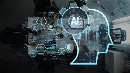 This visually engaging image illustrates the intersection of teamwork and artificial intelligence in a corporate setting, showcasing modern technology and innovation. Raster