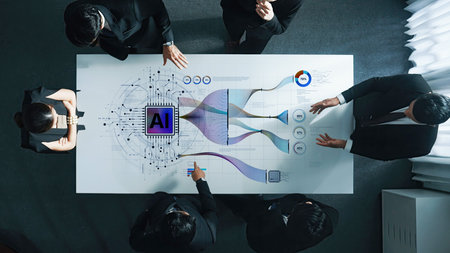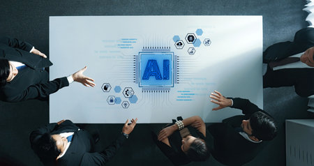 A group of diverse professionals engages collaboratively at a digital table, exploring artificial intelligence concepts and strategies to enhance business operations and efficiency.