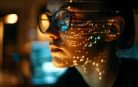 A female data scientist deeply focused on data analysis with digital patterns projected on her face in a high-tech environment