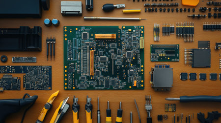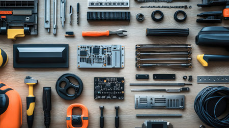 A comprehensive view of electronic components displayed neatly on a gray surface, showcasing a circuit board and various tools, perfect for technology and engineering projects.
