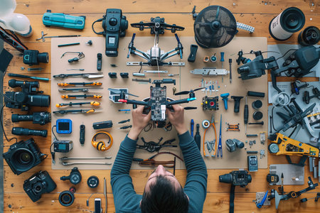 A meticulous arrangement of various electronic components, circuit boards, and tools on a blue background, showcasing innovation in technology and design.