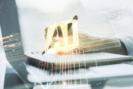 Double exposure of creative artificial Intelligence icon with hand writing in notebook on background with laptop. Neural networks and machine learning concept