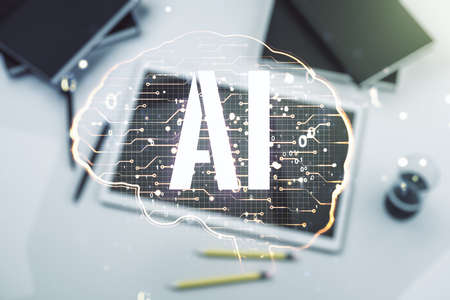 Creative artificial Intelligence symbol concept with modern laptop on background. Multiexposure