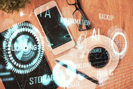 Double exposure of technology theme drawing over work table desktop. Top view. Global data analysis concept.