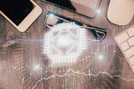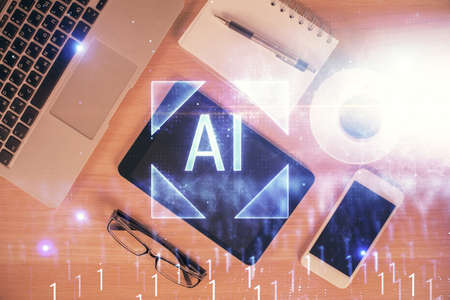 Double exposure of creative artificial Intelligence symbol and digital tablet on background, top view. Neural networks and machine learning concept