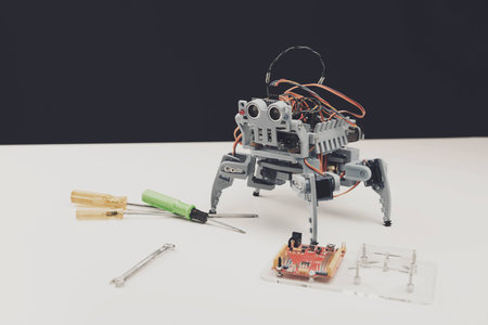 Robot close up. A small gray robot is on the table, next to it lie tools