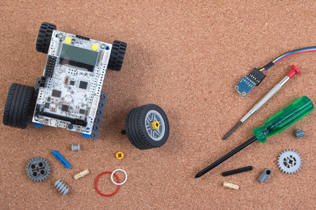Robot diy assembly kit. Electrical components kit for building digital devices. Robotics parts and elements lying on a wooden desk. Electronics module set