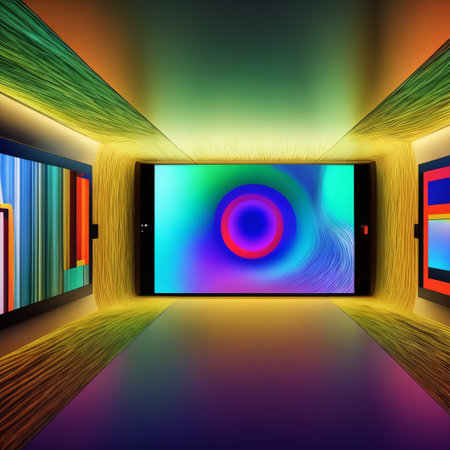3d rendering of a modern interior with a tv screen and colorful lighting