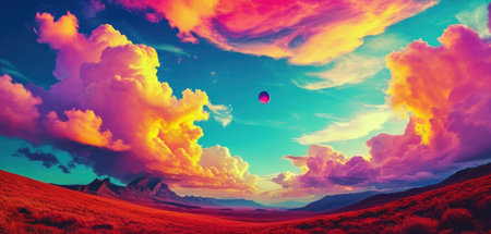 Colorful fantasy landscape with hot air balloon in the sky. 3D Rendering