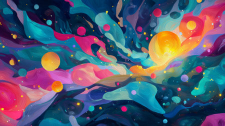 Dreamlike fantasy abstract background, vibrant swirling colors, floating orbs and shapes, magical surreal mood, vibrant palette