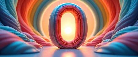 A striking number zero stands prominently in the foreground, crafted from layers of pastel colors, radiating warmth and creativity. The background features flowing waves in a spectrum of hues, creating a dreamy atmosphere that invites viewers into a whimsical world of imagination and possibility.