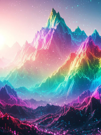 A surreal and vibrant rainbow mountain landscape illuminated by sparkling lights and a soft gradient sky, creating an ethereal and magical atmosphere.