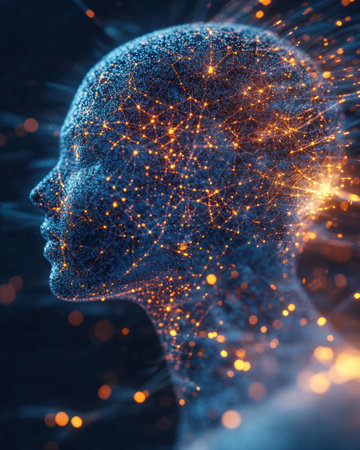 A captivating display of a human silhouette filled with luminous particles and intricate connections, symbolizing the complexity of the mind and technology.
