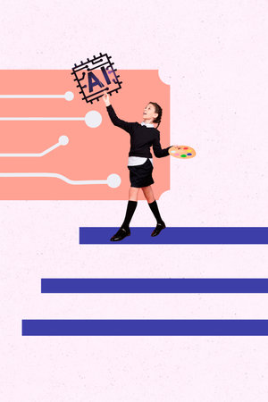 Template sketch image composite artwork collage of young schoolgirl walk drawing ink hobby back school class education university ai